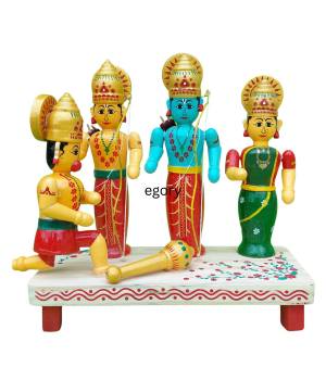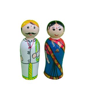 Handcrafted in the artisanal village of Etikoppaka, this wooden Bride Set showcases the elegance of traditional South Indian wedding motifs through vi..
